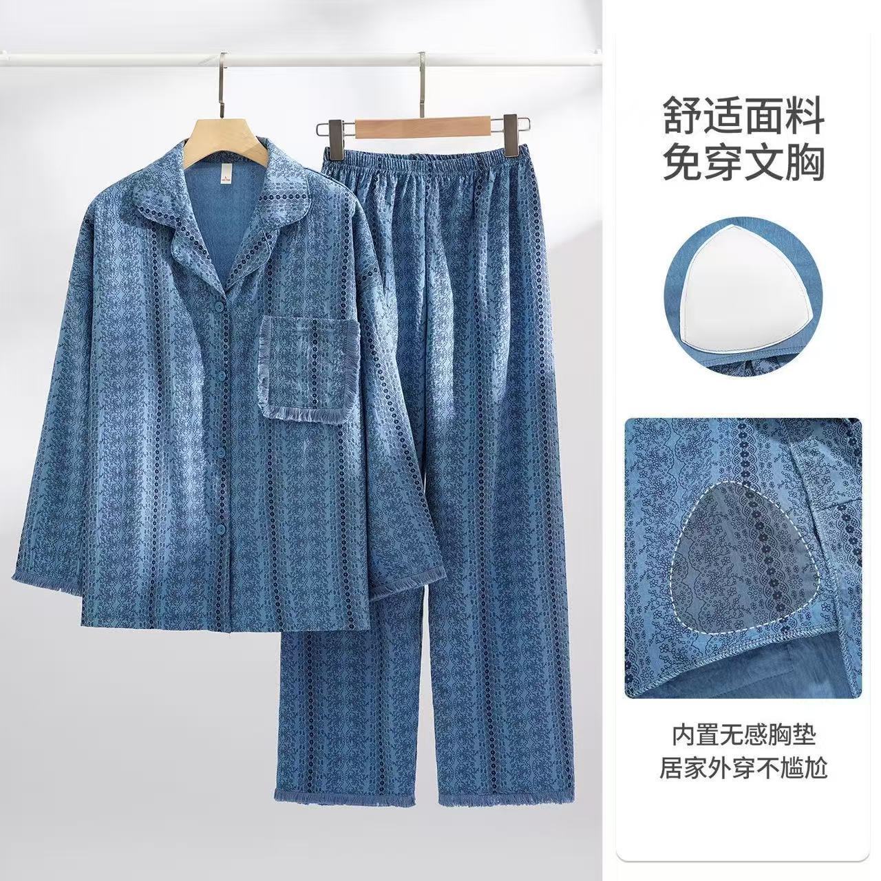 简约高级感春秋新款睡衣带胸垫云朵棉长袖长裤睡衣女士宽松家居服