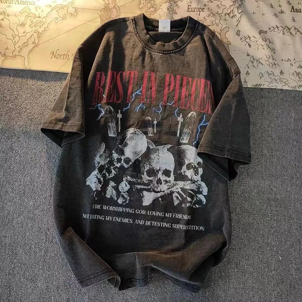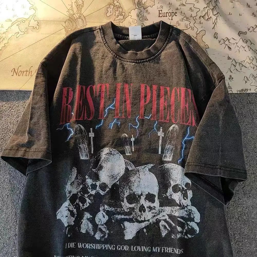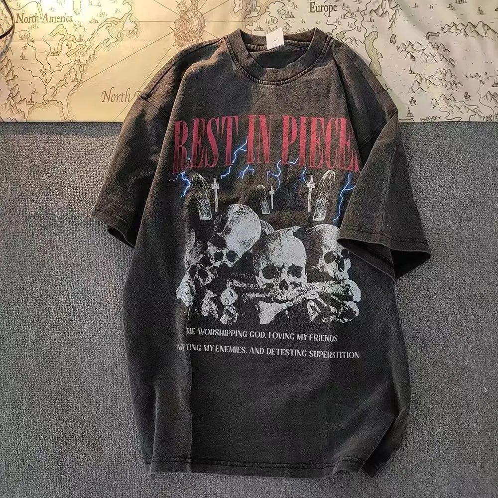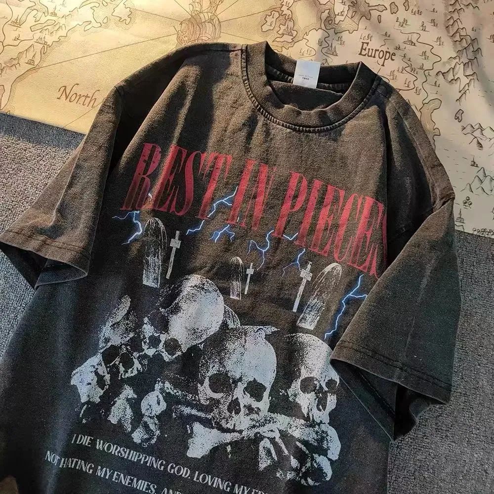 100%不起球美式高街骷髅印花水洗做旧复古短袖男T恤休闲宽松上衣