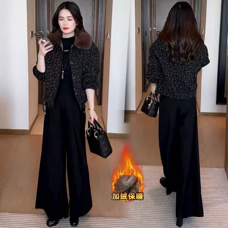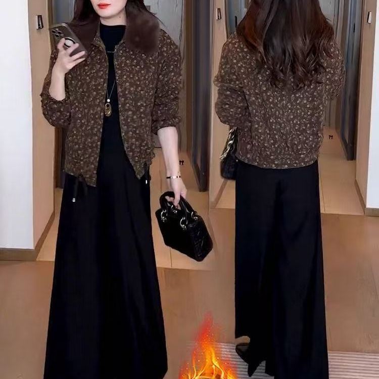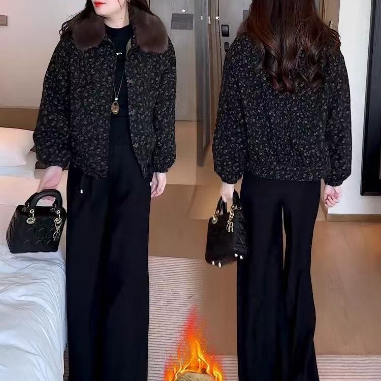 2025冬季妈妈新款印花短款外套女加绒加厚洋气显瘦保暖大毛领上衣