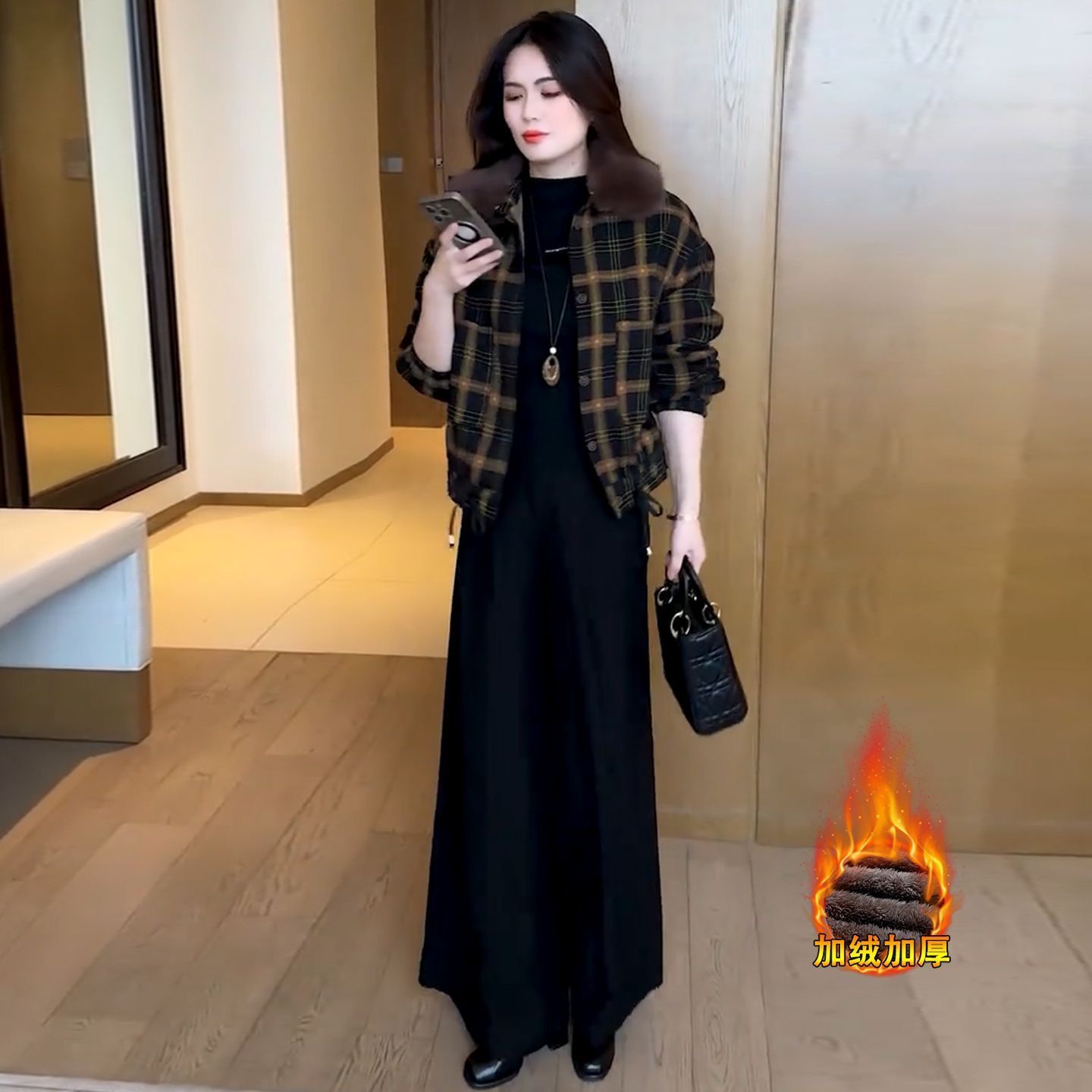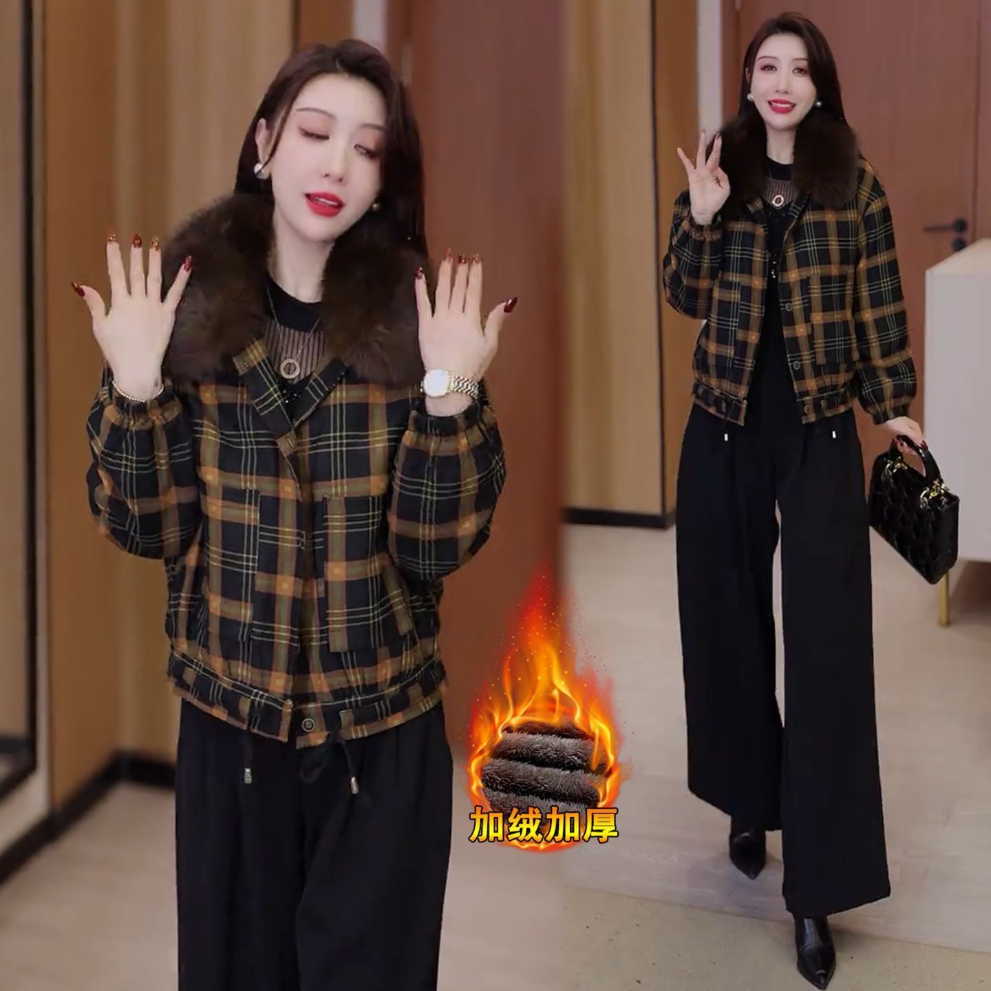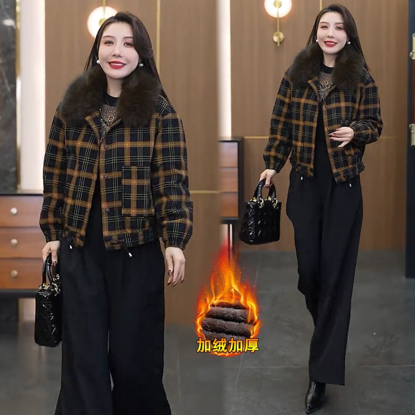 加绒加厚高档女外套2025冬季新款时尚洋气宽松妈妈装格子保暖上衣