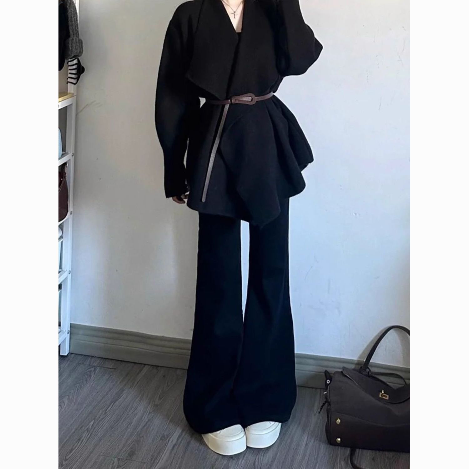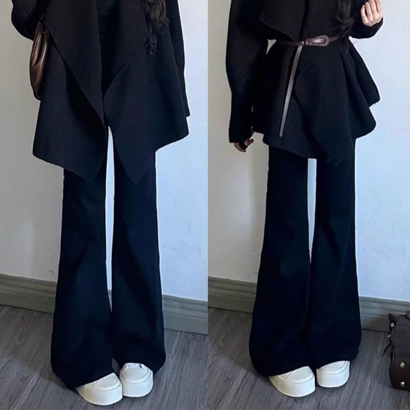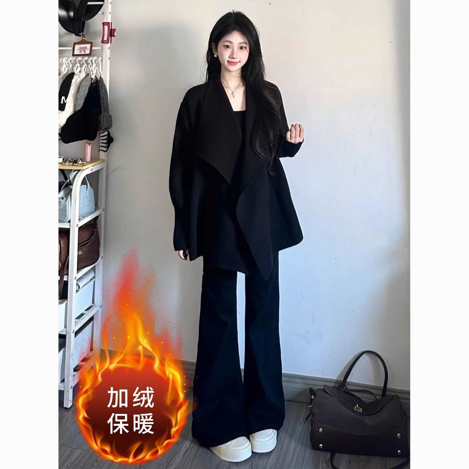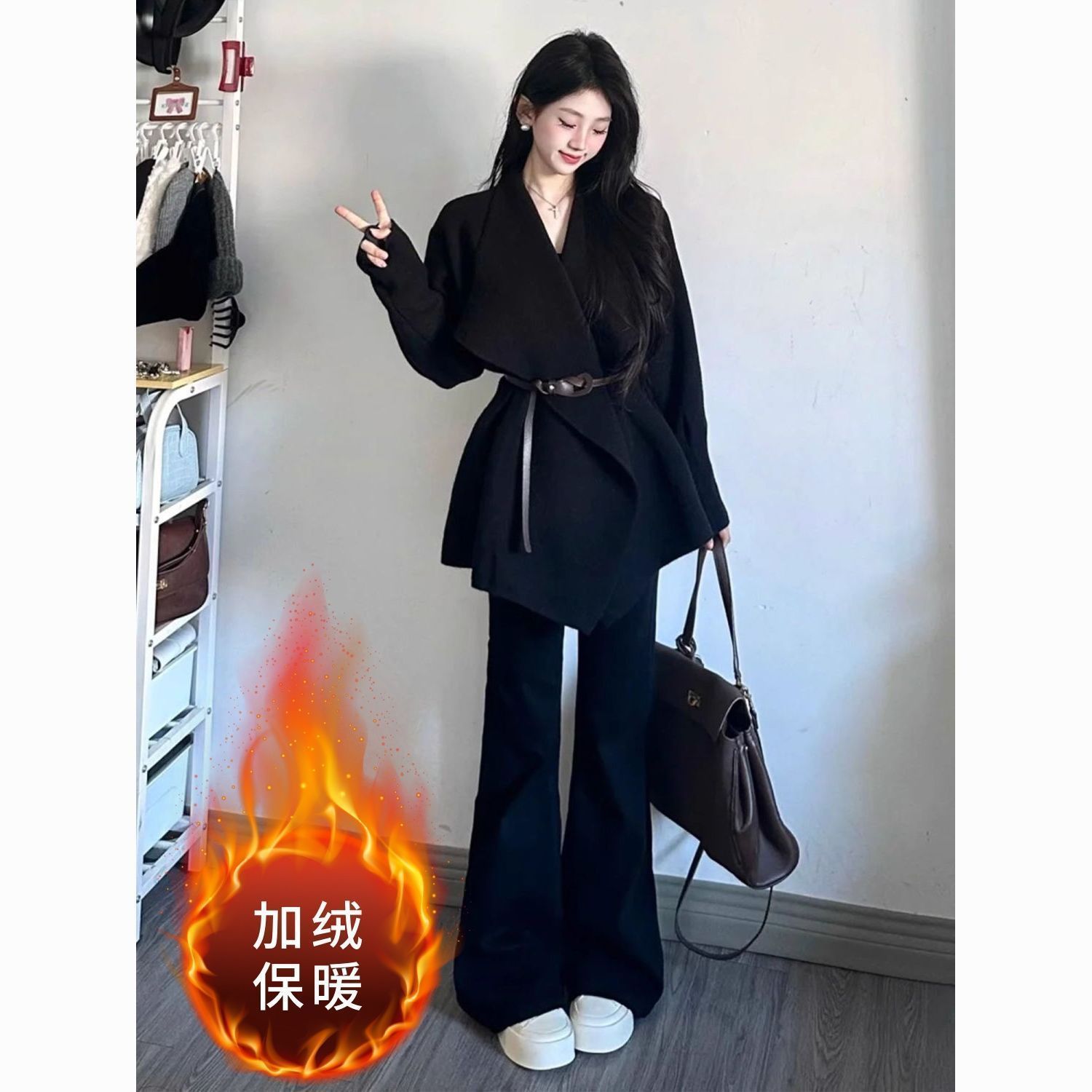 2025年秋冬新款黑色加绒高腰微喇女牛仔裤修身显瘦辣妹马蹄喇叭裤