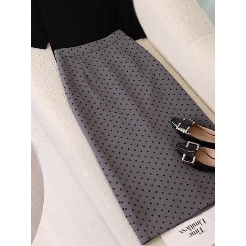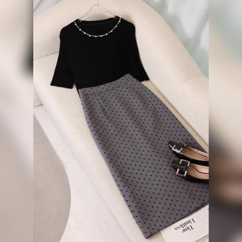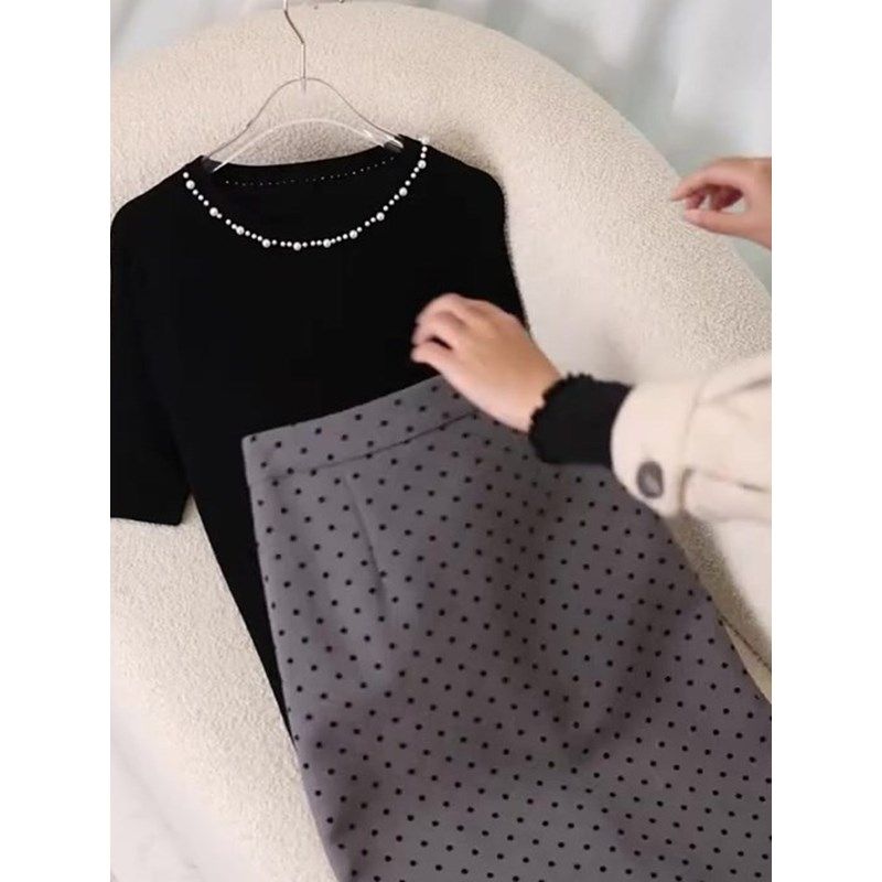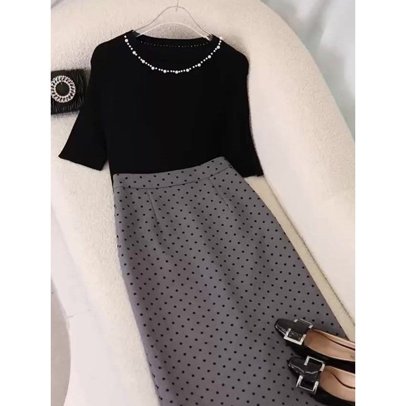 温柔风百搭黑色圆领套头上衣灰色波点半身裙2026夏季新款减龄套装【7天内发货】