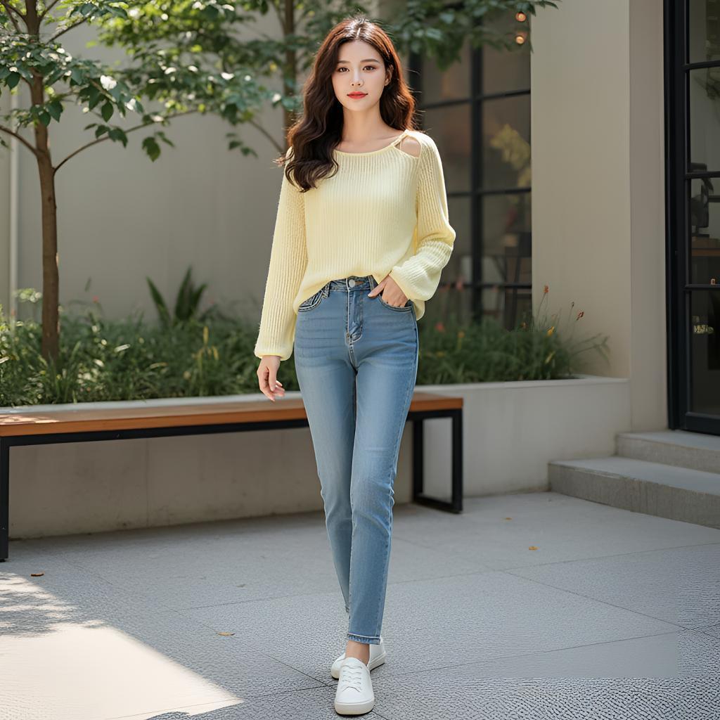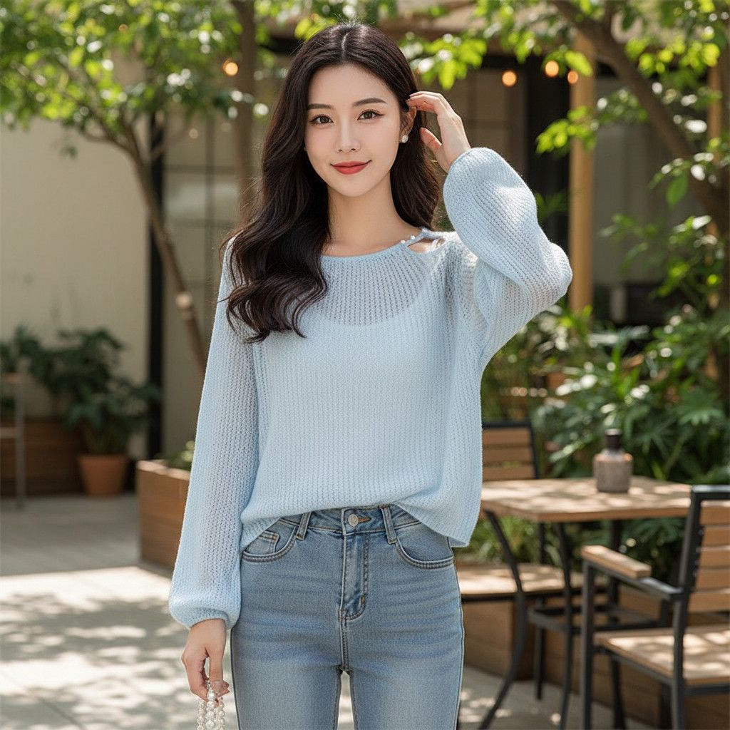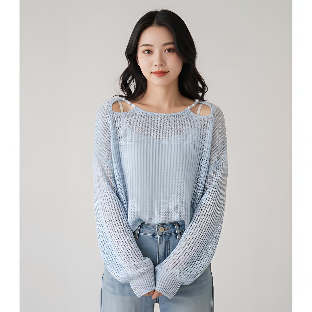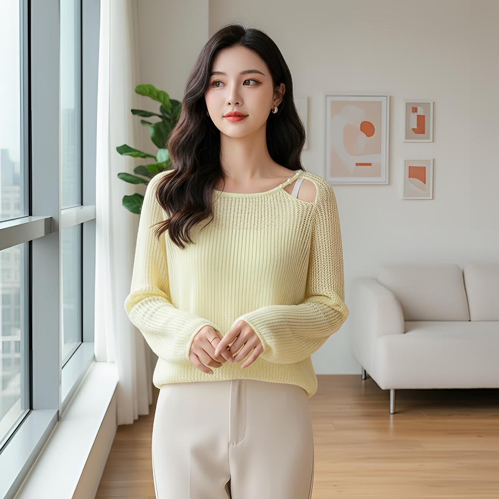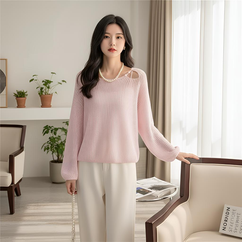 春日慵懒风长袖毛衣爆款通勤休闲韩版套头露肩针织衫心机斜领斜肩